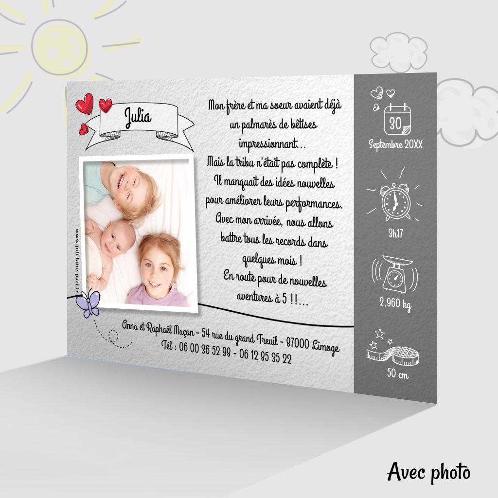 Vous avez déjà 2 enfants ? Ou votre bébé est issu d'une famille recomposée ? Voici le faire-part de naissance idéal pour vous, 100% fabrication française ! Composez votre famille à volonté en déplaçant simplement les petits nœuds et les petites moustaches pour différencier les filles des garçons. C'est le faire part de naissance top tendance du moment, à personnaliser avec ou sans photo, en simple ou en double volet, pour encore plus de liberté avec Joli Faire Part !