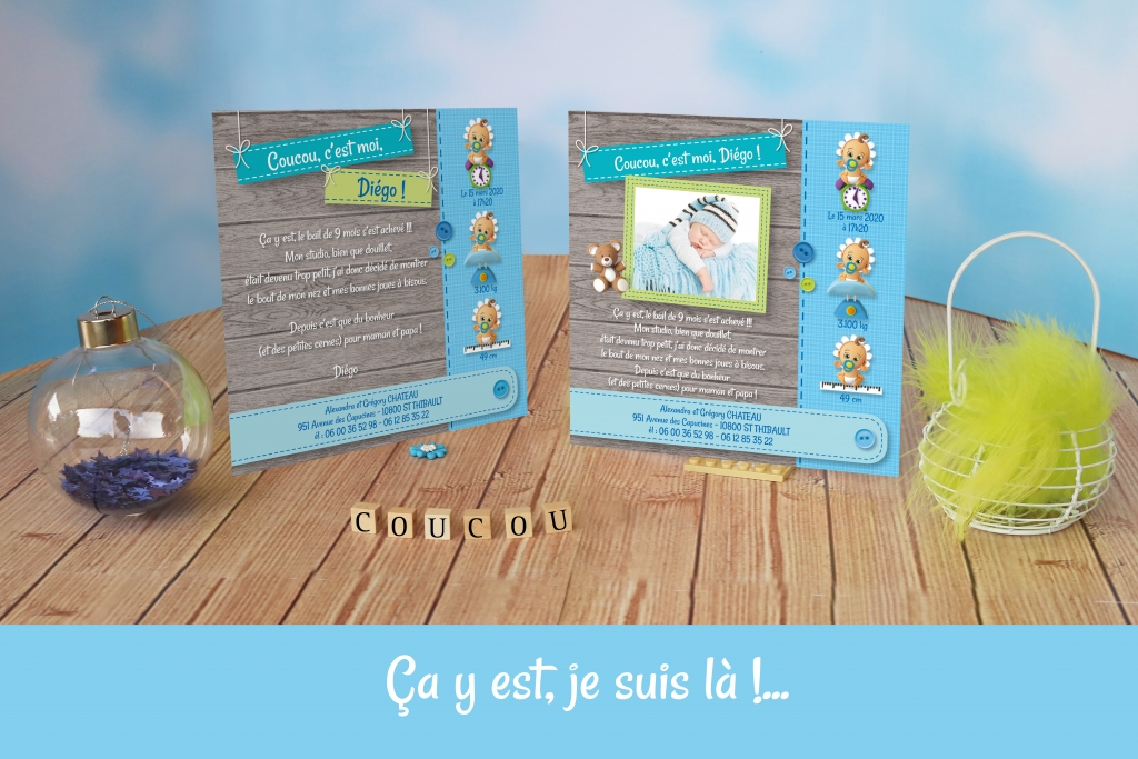 Nous pouvons modifier les modèles de votre faire-part de naissance ou de votre carte de remerciement (couleurs, cadre photo, ajout / suppression de personnages...), contactez-nous !