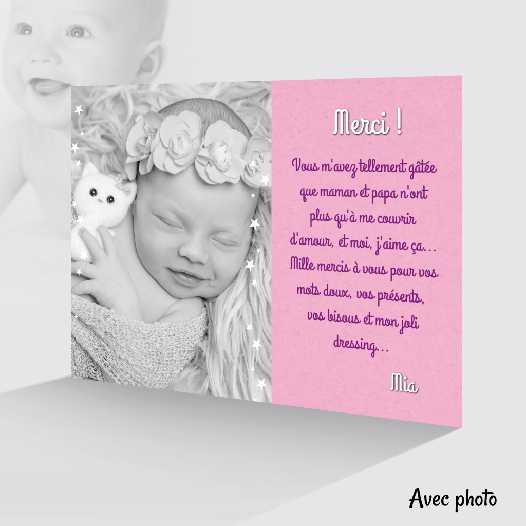 Ce modèle de carte de remerciement est disponible avec ou sans photo.