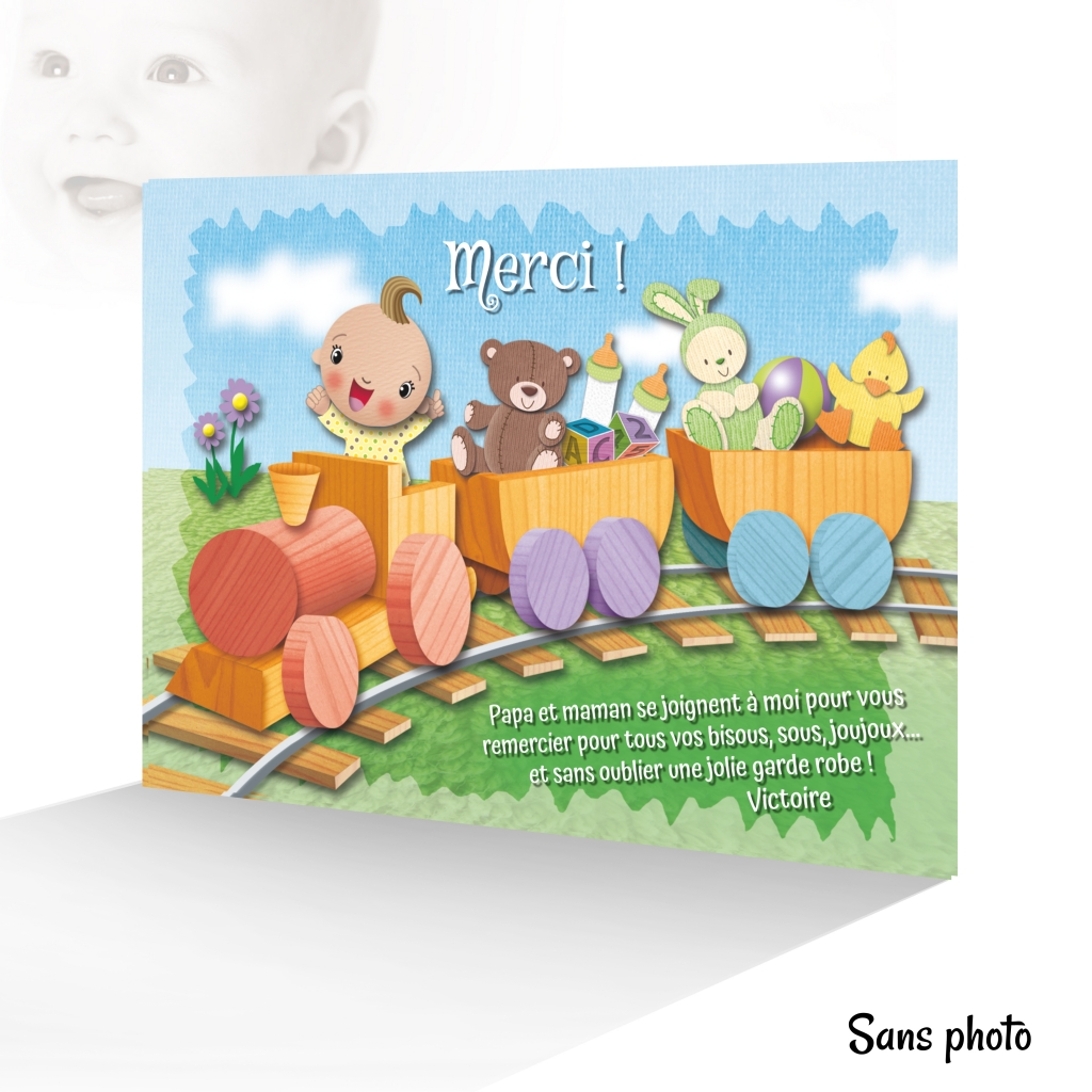 Après être arrivé en gare du bonheur, bébé reprend le train pour aller remercier tous les membres de sa famille et ses amis ! Avec cette magnifique carte de remerciement « petit train du bonheur » de Joli Faire Part, l’aventure de votre bébé continue !