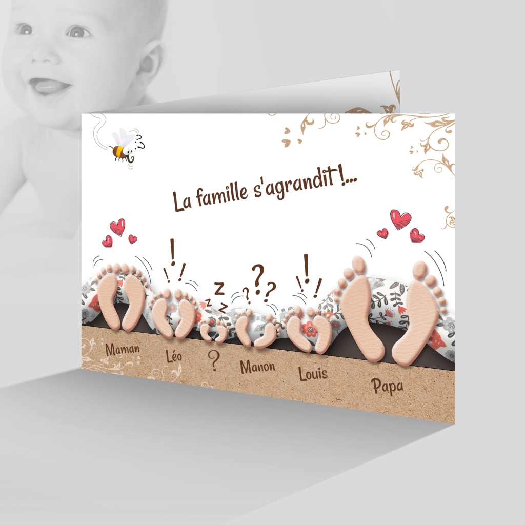 C'est votre 4ème enfant ? Voici le faire-part de naissance idéal, humoristique avec les pieds de toute la famille sous la couette pour représenter avec humour votre belle famille ! Un joli fond en papier kraft à été choisi par notre graphiste pour le côté bohème de ce magnifique faire-part de naissance original, à personnaliser avec ou sans photo, à votre convenance.
