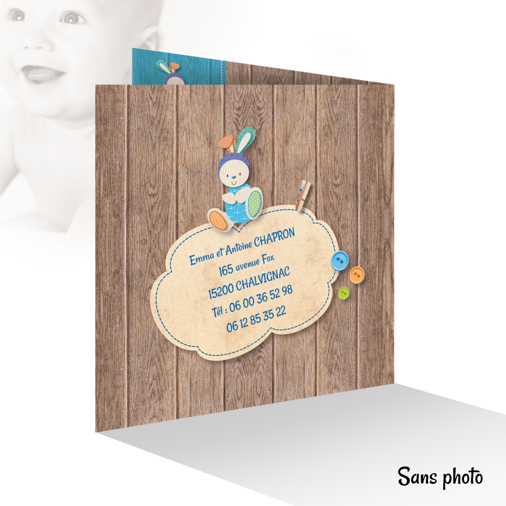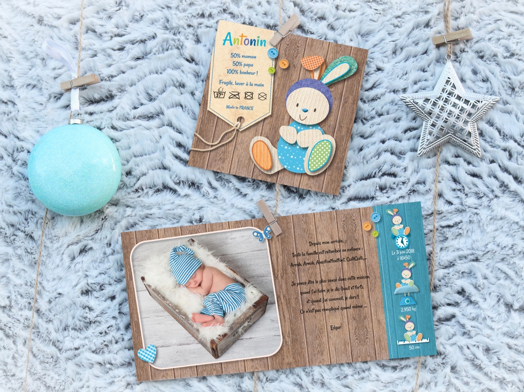 Et s’il y avait une étiquette de lavage et de composition sur votre nouveau né ? Quelle drôle d’idée !!... C’est pourtant ce que vous propose notre infographiste avec sa nouvelle collection de doudous avec leurs étiquettes d’entretien, made in Joli Faire Part ! Ce faire-part de naissance pour un garçon a été conçu avec tendresse et humour : la douceur du lapin, réalisé avec des morceaux de tissus très colorés, et sans oublier l’humour avec son étiquette de lavage : car il s’agit d’en prendre soin, le bain à 37°, pas de lavage en machine… de quoi faire rire aux éclats petits et grands !