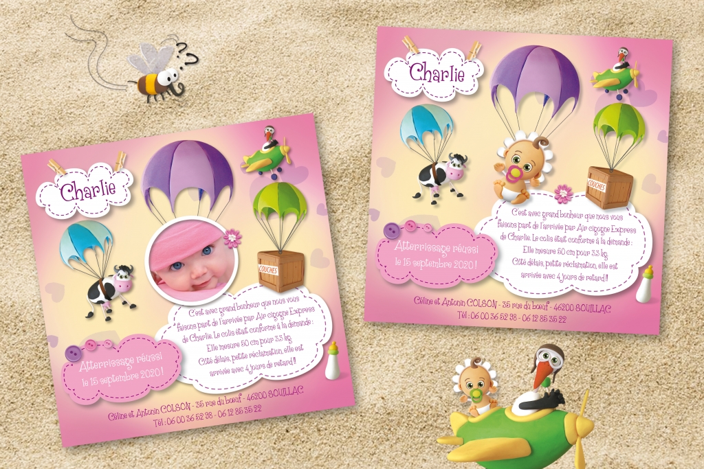 Que vous soyez fan de parachutisme ou d’aviation, ou que vous souhaitez tout simplement annoncer avec humour la naissance de votre bébé fille, voici le modèle de faire-part de naissance qui plaira à coup sûr ! Le tout créé en pâte à modeler : La cigogne parachute bébé de son avion… avec son chargement ! Il y a même une vache pour les bébés à gros appétit…