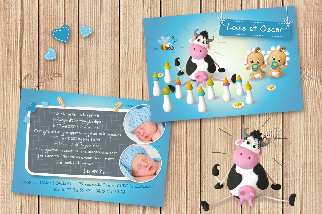 Avec des jumeaux, vous voilà doublement comblés ! Vous recherchez un faire-part de naissance humoristique pour caricaturer le rythme incessant des biberons ? Ce modèle de faire-part vous plaira à coup sûr ! Et c’est Madame la vache qui s’en charge, et visiblement… ça l’épuise ! Il faut dire que des jumeaux, à raison de 6 à 8 biberons par jour, si en plus ils ne mangent pas en même temps, il faut suivre, et même la nuit !! Ce faire-part de naissance jumeaux est conçu pour 2 jumeaux garçons.