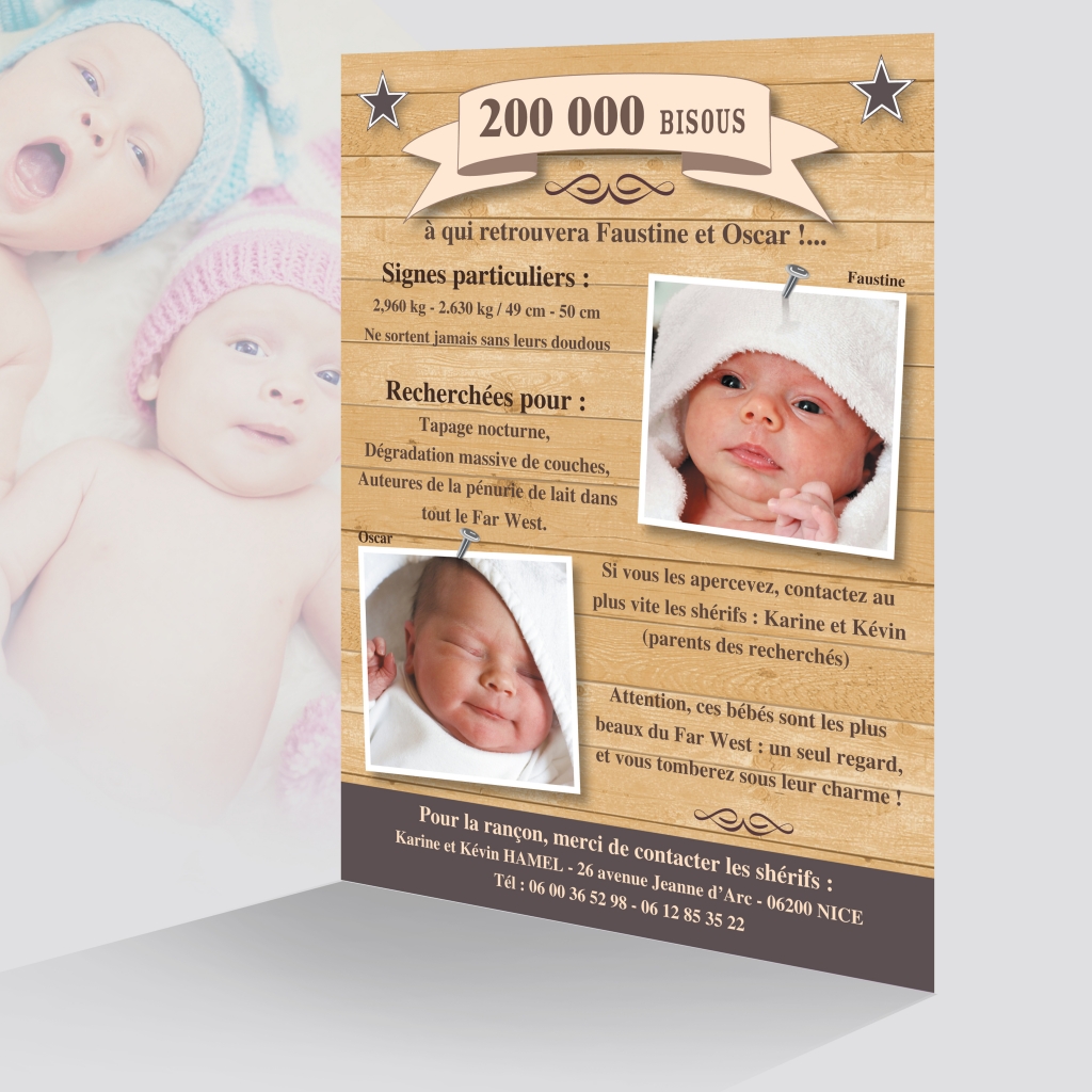 Des jumeaux ? Félicitation ! Il vous faut maintenant marquer les esprits de votre entourage, avec un beau faire-part de naissance humoristique : et si vous alliez faire un tour du côté du Far West pour vous inspirer ?... envoyez vos 2 petits jumeaux au Far West, le temps d’un faire-part : WANTED, votre fille et votre garçon sont recherchés contre rançon pour tapage nocturne, dégradation de couche… et pour cause, ils sont 2 ! De quoi faire rire aux éclats petits et grands ! Choisissez vos plus belles photos pour ce faire-part de naissance humoristique pour des jumeaux : il s’agit de ne pas les laisser s’échapper !!