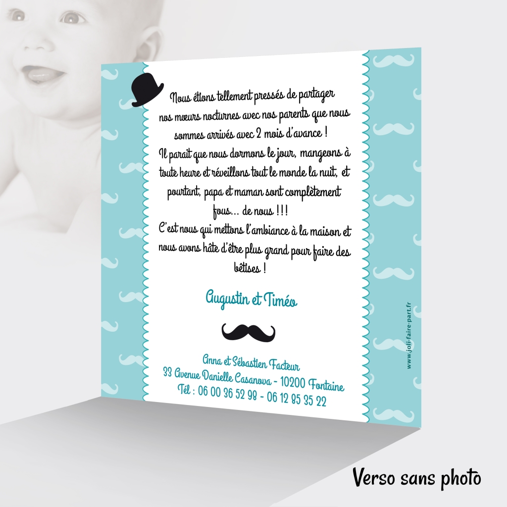 Optez pour un joli faire-part de naissance pour la naissance de vos jumeaux garçons : nous avons sélectionné un élégant fond bleu parsemé de moustache, pour accentuer le côté garçon ! De belles étiquettes façon papier kraft illustreront sobrement les informations principales de vos jumeaux garçons : l'heure de naissance, le poids et la taille. Vos 2 bébés sont représenté chacun par une moustache et un chapeau, cette fois pour le côté humoristique du modèle ! Il ne vous reste plus qu'à personnaliser ce beau modèle de faire-part de naissance jumeaux à votre gout, avec vos plus belles photos, n'hésitez pas à tenter le noir et blanc !