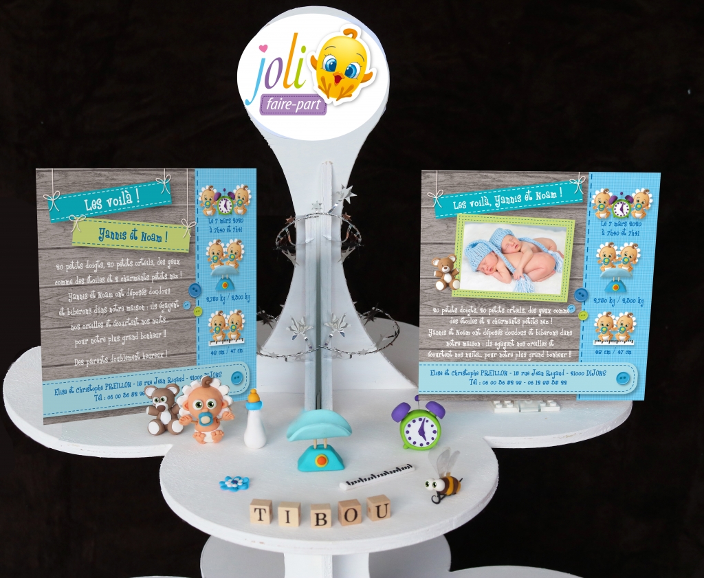 Sur ce faire-part de naissance jumeaux pour des garçons, nous avons opté pour un fond gris, afin de mieux faire ressortir les tons bleus et vert pour des garçons. Ce faire-part très tendance vous permet d’annoncer la naissance de vos jumeaux dans la douceur et la tendresse, avec une manière très originale de faire ressortir les informations primordiales de la naissance : la date, le poids et la taille. Des petites figurines rigolotes réalisées en pâte à modeler soulignent ses informations. C’est à vous maintenant de le personnaliser en quelques clics seulement !