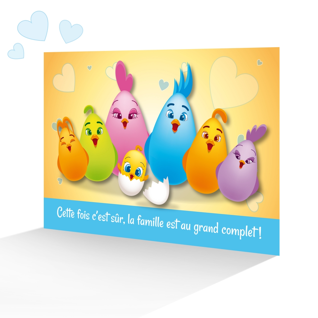 Quelle famille ! 5 enfants, ça n’est pas rien, vous devez être très occupés avec les Grands Frères et Sœurs : alors ne perdez pas votre temps sur Internet à chercher un faire-part naissance original et humoristique pour les familles nombreuses, il y en a peu. Voici celui qu’il vous faut, et qui plaira à coup sûr aux grands frères et aux grandes sœurs. Laissez-vous attendrir par ces petits personnages drôles et attachants, aux couleurs acidulées pour encore plus de gaité !