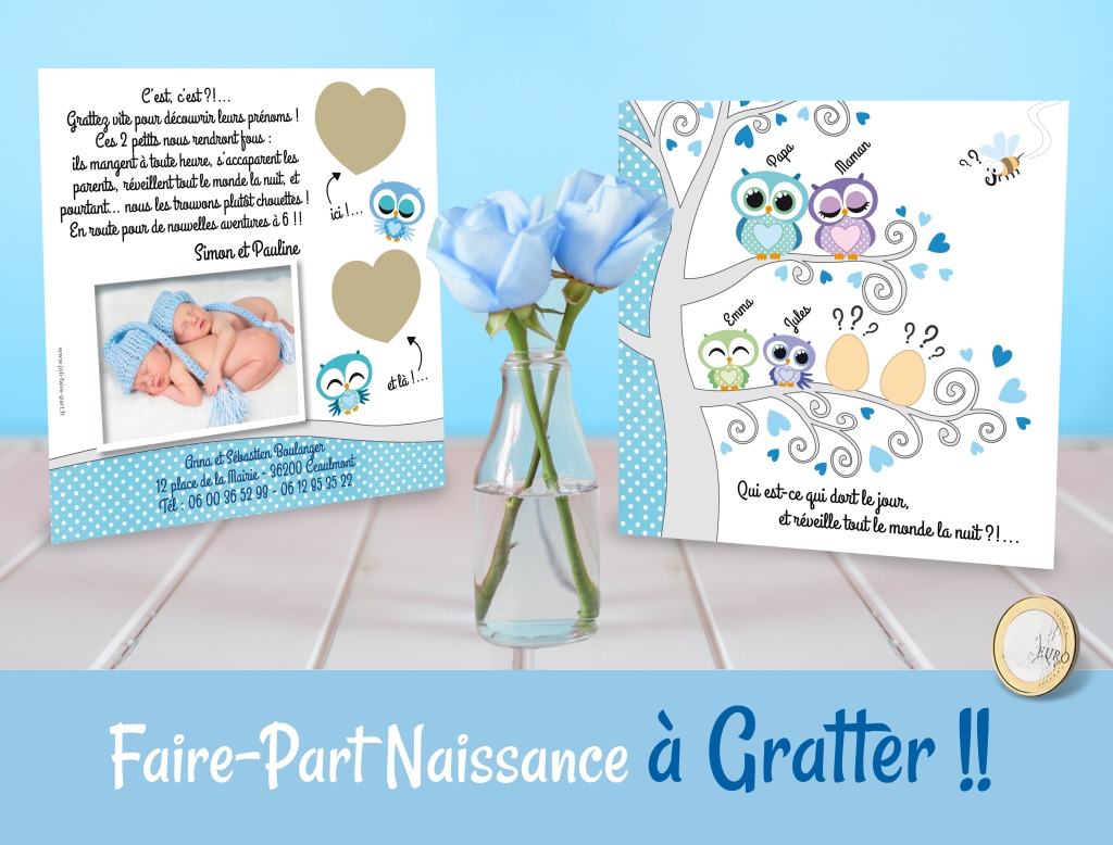 Avec le faire-part de Naissance jumeaux garçons à GRATTER, ce n'est pas 1, mais 2 pastilles à gratter que vos proches devront gratter afin de connaitre les prénoms de vos jumelles ! Ce modèle original est en plus adapté pour les familles nombreuses, qui ont déjà 2 enfants et qui attendent des jumeaux. Cette famille de chouettes très attendrissante a été conçu avec humour et tendresse avec une dominante de blanc, pour encore plus de douceur. Une création 100% originale de Joli Faire Part, 100% français, que vous ne retrouverez nulle part ailleurs !
