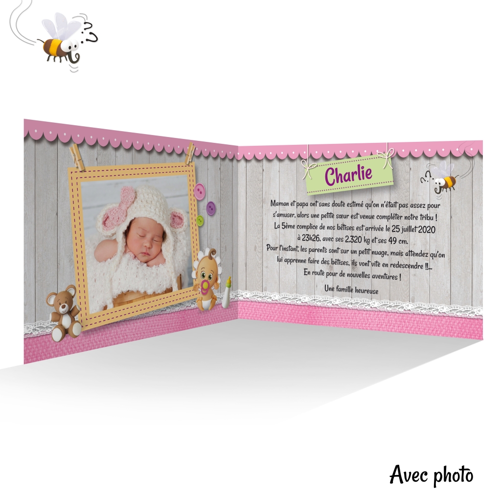 Ce modèle de faire-part pour les familles nombreuses plaira à coup sûr aux grands frères et sœurs : des petits pieds, des petits pieds, toujours des petits pieds… il y en a tellement, on arrive plus à les compter ! Cette fois c’est sûr, la famille est au grand complet ! Et ces petits pieds, là, au milieu de la fratrie, mais à qui sont-ils ? Vous le découvrirez en ouvrant votre faire-part de naissance 5ème enfant pour une fille.