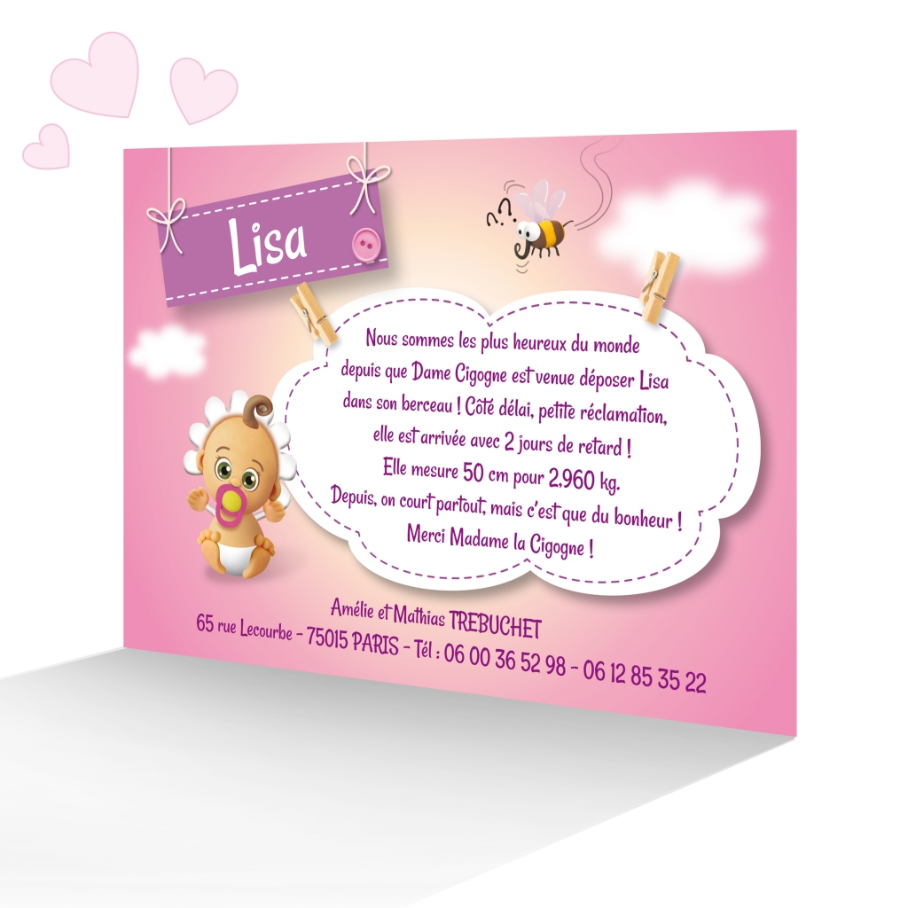 Le plus grand classique en matière de faire part naissance : la cigogne apportant le petit bébé chez ses parents, mais quand ils sont mis en scène par notre infographiste, ça change tout ! Les personnages sont faits en pâte à modeler (comme beaucoup dans notre boutique) et c’est une exclusivité de Joli faire part. Ce modèle de faire-part de naissance a été conçu pour une fille, alors le ciel devient rose !