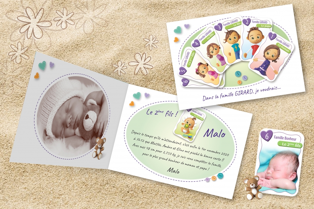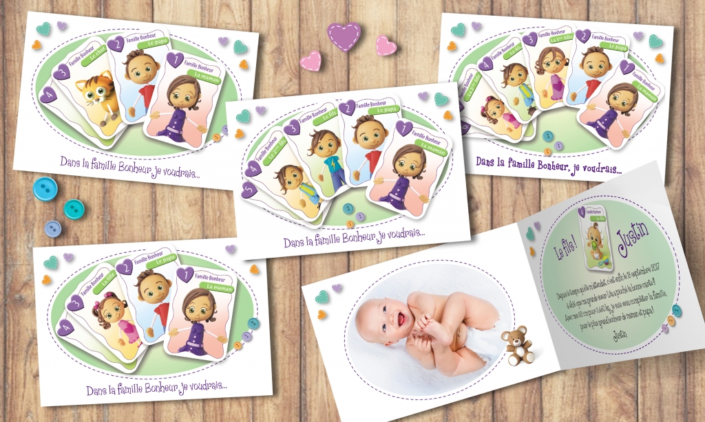 Que les familles nombreuses se rassurent, notre graphiste a conçu toute une gamme de faire-part de naissance spécialement pour elles ! Avec notamment un des produits phare de notre boutique : le faire part de naissance 7 familles, que nous avons décliné pour 1 enfant, 2 enfants, 3 enfants, et même ici pour votre 4ème enfant. Ce joli modèle de faire part original présente votre famille à travers des cartes : papa, maman, votre fils, vos 2 filles, et à l’intérieur ou au dos du faire-part de naissance vous découvrez la carte de votre bébé.