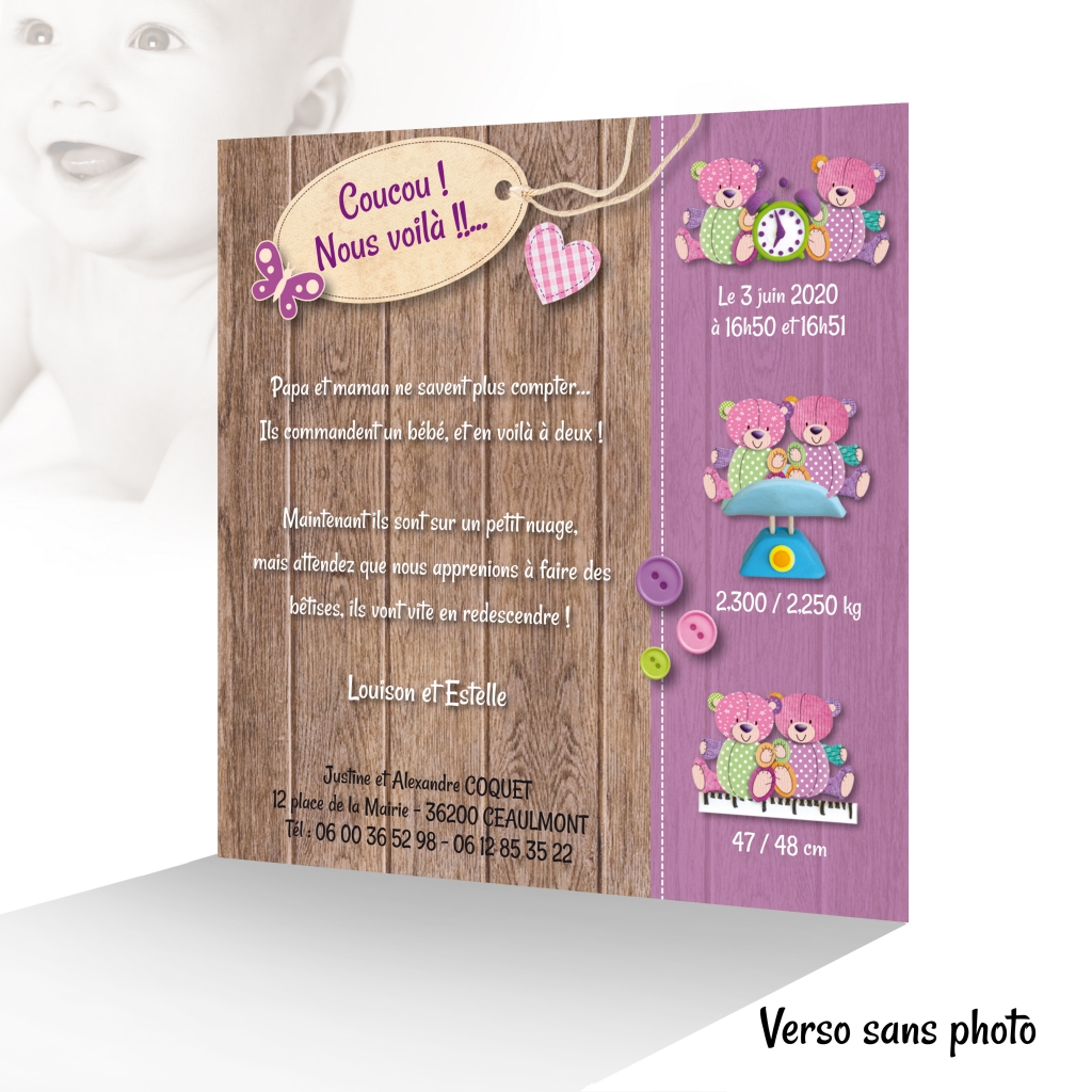 Des jumeaux ?!... vous avez fait un Strike ! Félicitation, voilà à coup sûr un événement qui ne vous arrivera qu’une seule fois dans votre vie. Alors il faut marquer le coup avec un joli faire part de naissance pour des jumeaux filles, et avec humour et tendresse, ce sera encore plus marquant ! Votre entourage va l’adorer, c’est sûr ! Quel bonheur : 50% papa, 50% maman : 200% bonheur… le compte n’est pas bon, mais on a bien compris que vous étiez doublement heureux ! Et avec vos plus belles photos, ce sera encore plus beau !