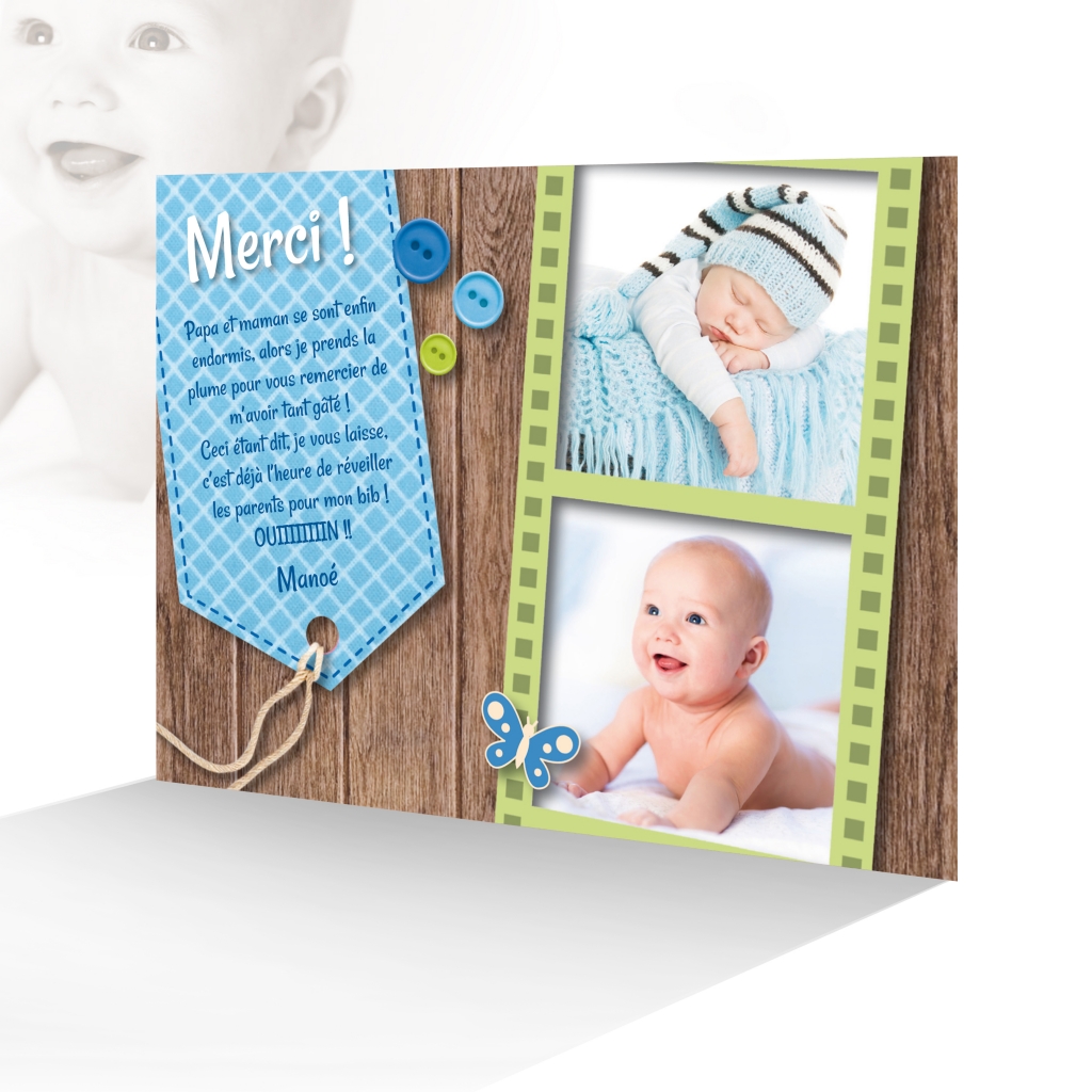 Carte Remerciement Garçon Bleu Unique 2 Photos